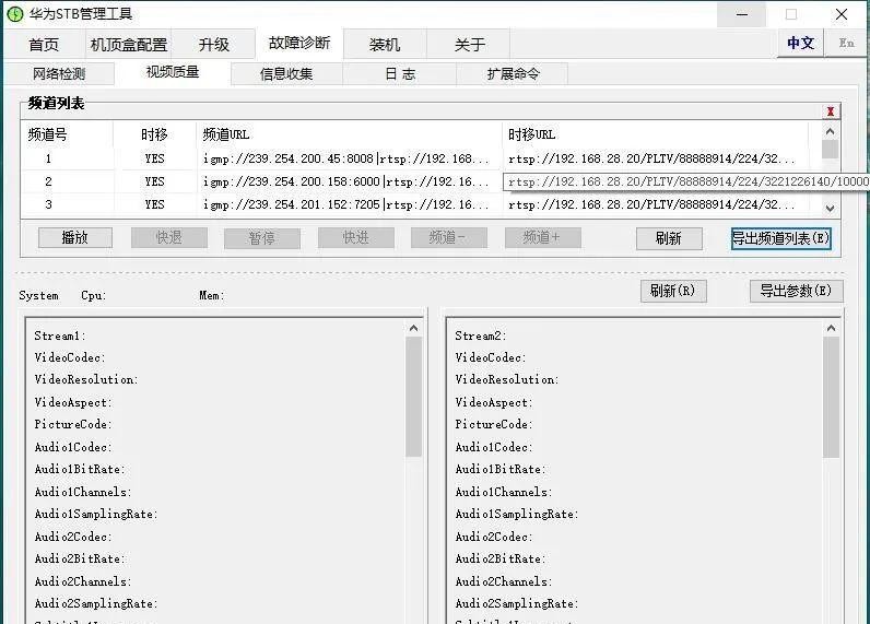 连接成功后,找到故障诊断选项,然后点击一下刷新按钮,这时候就能看到频道列表里已经有信息了,这些就是视频源。我们点击导出频道列表按钮,将信息保存到TXT文件中。