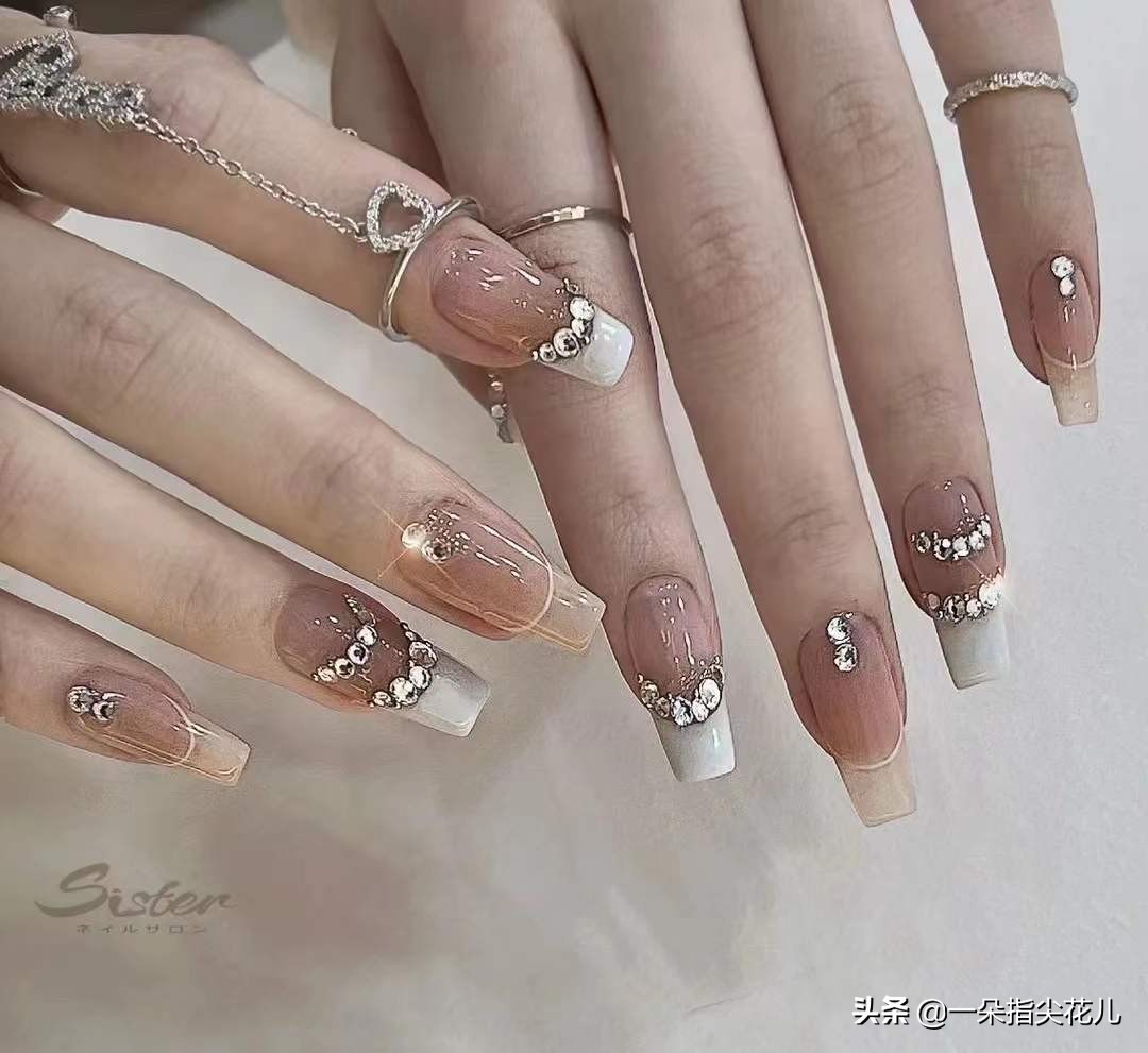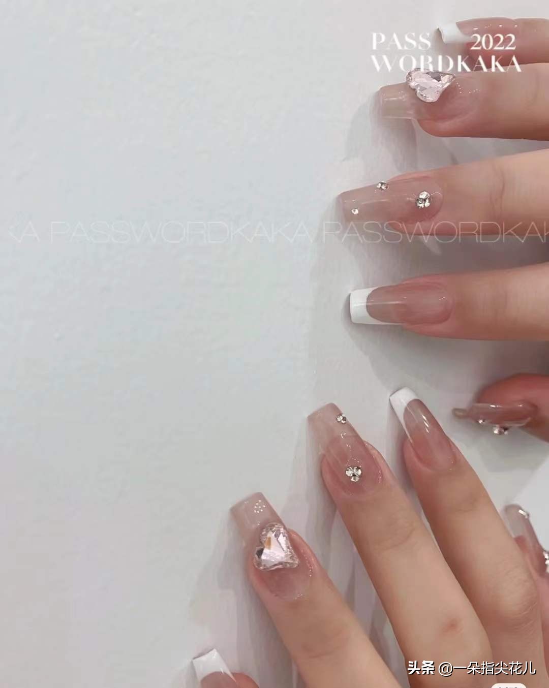 第四款:冰透裸色系打底,搭配白色弧形法式,白色平底钻。这一款当做新娘甲也是相当不错哦!