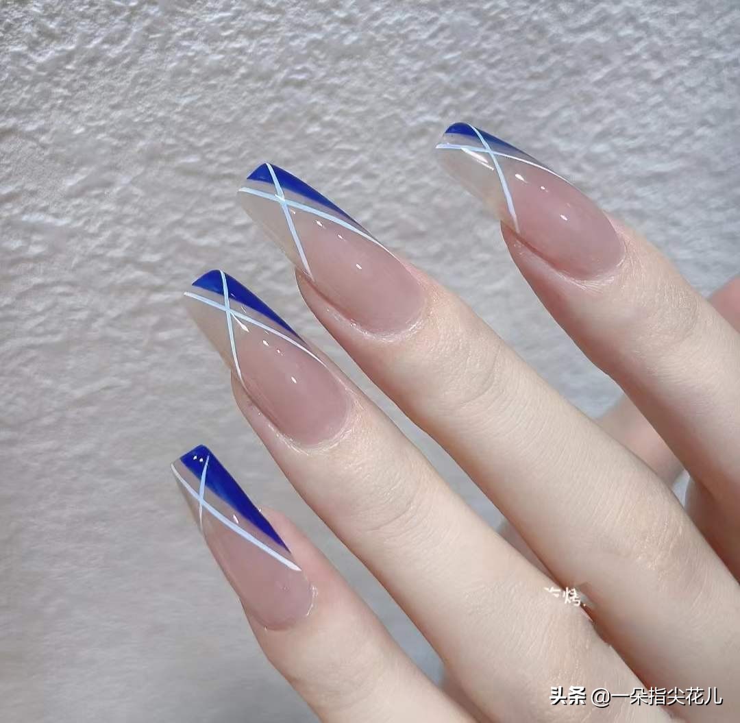 第六款:果冻白色系打底,搭配克莱因蓝色斜边和白色线条,做出交错法式美甲,气质御姐风。