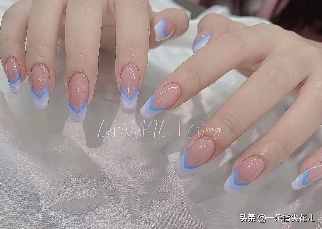 第七款:豆沙粉裸透色打底,搭配渐变色画出V型法式(白色,浅蓝,天蓝)。