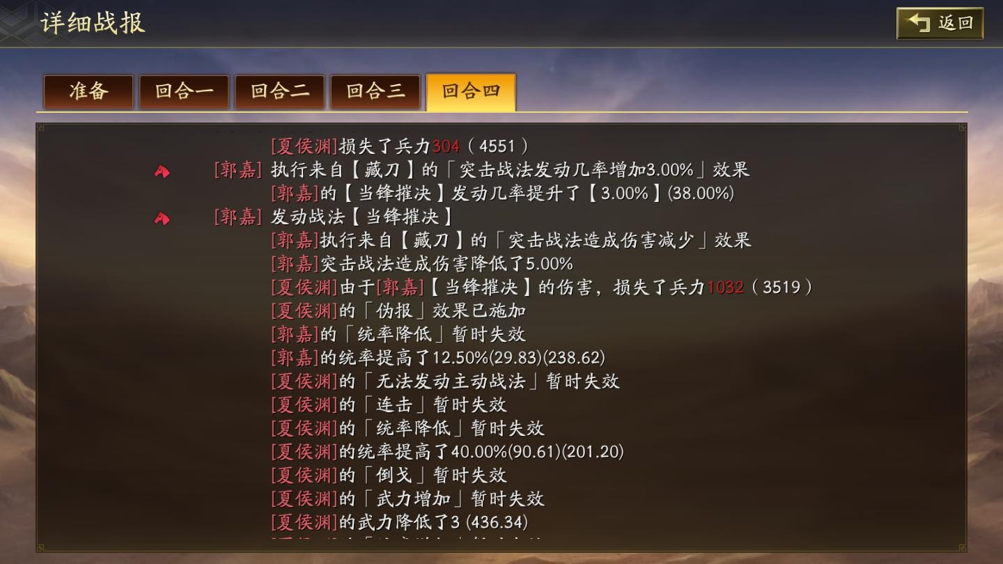 但是贾诩就不怕,这场对战渊骑战斗中,夏侯渊和郭嘉是满红,郭嘉还带有当锋,满红的郭嘉智力高,发动奇正相生几率就很高。虽然夏侯渊前两个回合不怕混乱,但是郭嘉会混乱,第二回合混乱的郭嘉,当锋催决直接打到夏侯渊了!导致夏侯渊连击和减伤都消失了。在第三第四回合对方全员混乱,郭嘉不出意外的又给夏侯渊上当锋了!缺少保护的夏侯渊,被贾诩两个回合打败,混乱出奇迹啊!