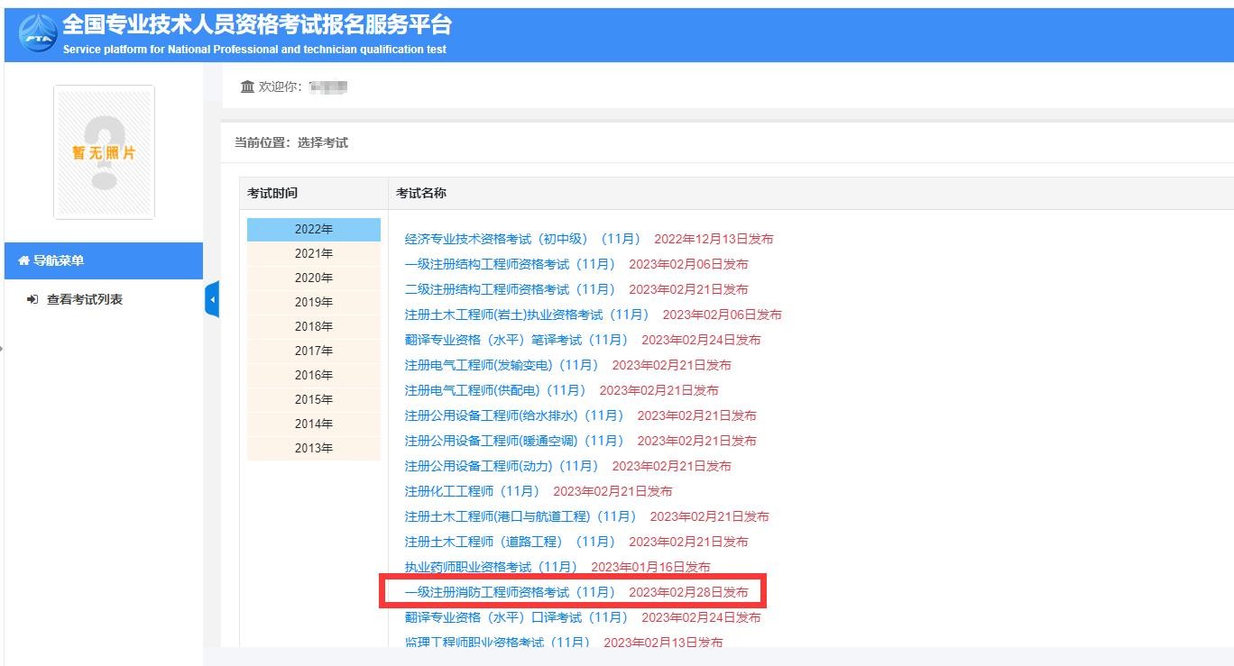4.选择考试年度2022年,找到“一级消防工程师”点击即可查询成绩