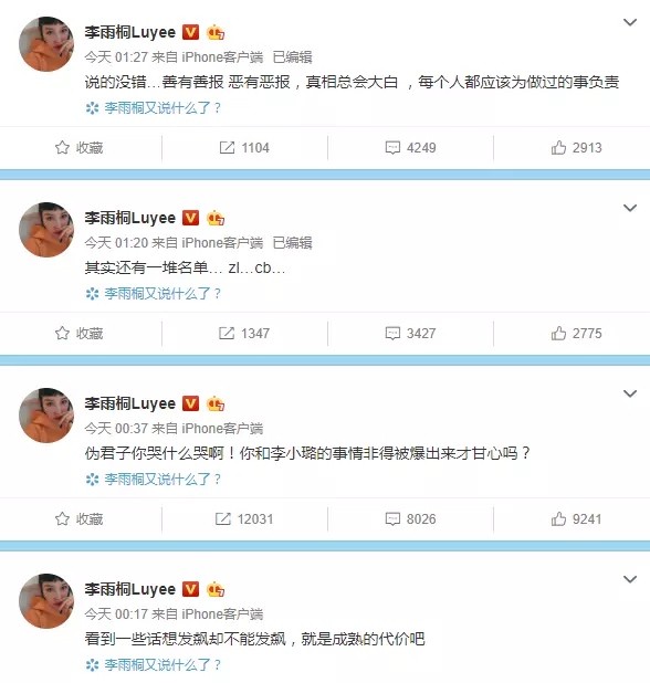28号上午,李雨桐先是删掉了那些爆文,又发文称:无辜的人被伤害并不是本意,继续忍吧。可作为一个成年人,连自己的情绪都控制不住,随意发表自己的言论,爆料别人的隐私,你一时冲动说出的话,很可能伤害了别人,懂吗?不管对方做的对与错,自有他的惩罚,但不顾他人感受,肆意抒发自己的行为,真的很不尊重人,你有今天这种结果,相信也绝非偶然。