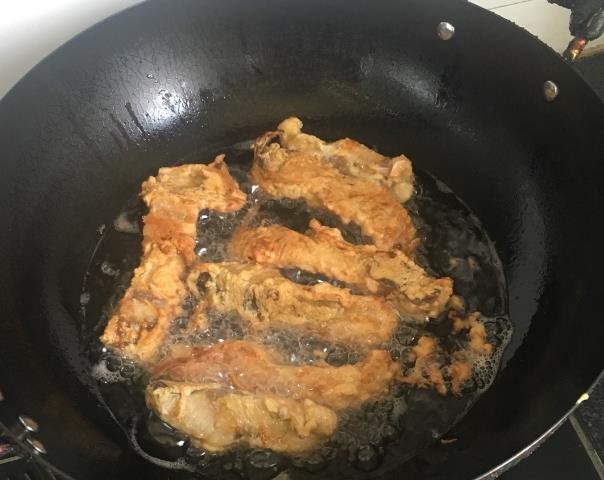 接下来,热锅冷油,将油烧至五成热,将裹好面粉糊的鱼肉放入油中,小火慢炸,炸至表面金黄酥脆,即可捞出控油。