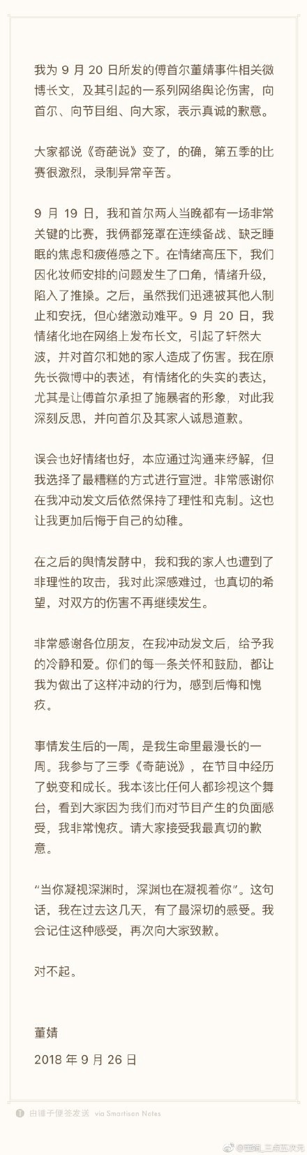 9月26日晚,董婧发布长文致歉,表示自己和首尔两人当时都处于备战的高压之下,情绪升级,难以控制,发生口角,并陷入推搡。又由于激动难平,9月20日发布长文,引发轩然大波。对此深刻反思,向首尔及其家人诚恳道歉。