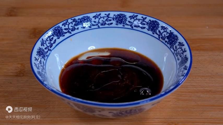 9. 碗中加入一勺白糖、生抽、陈醋、蚝油、一点小磨香油,用勺子搅拌均匀备用。