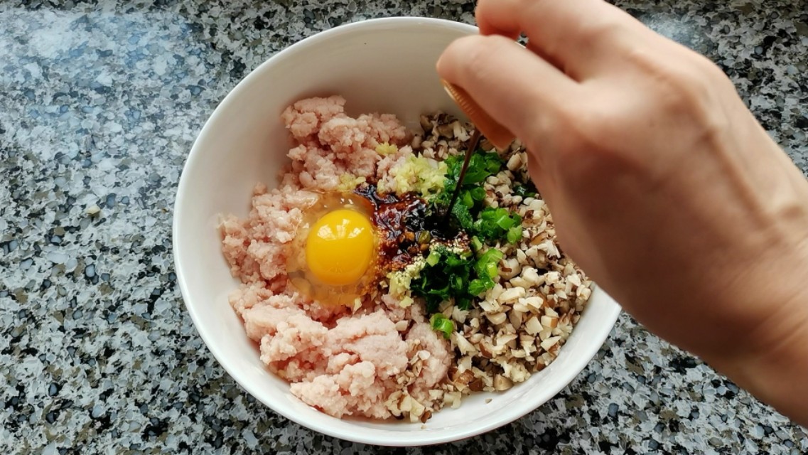 2,碗里放入绞好的肉馅,加入香菇碎,葱花、姜末,打入一颗鸡蛋,加适量盐、鸡精、生抽、酱油、香油,搅拌均匀备用。
