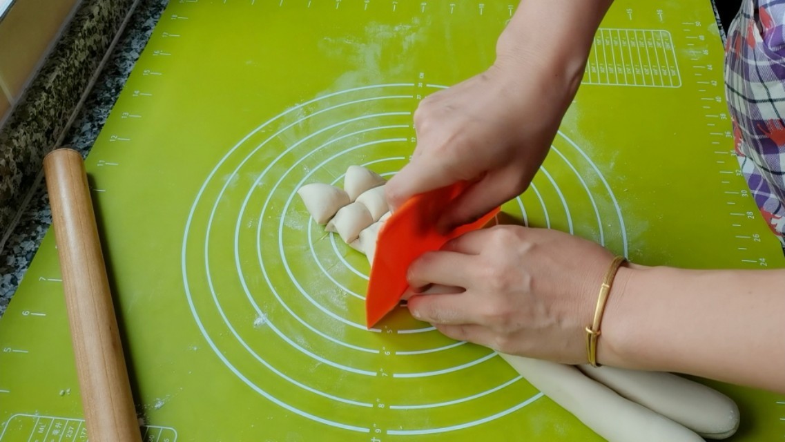 3,醒好的面团,揉搓几下,搓成长条均匀分块备用。