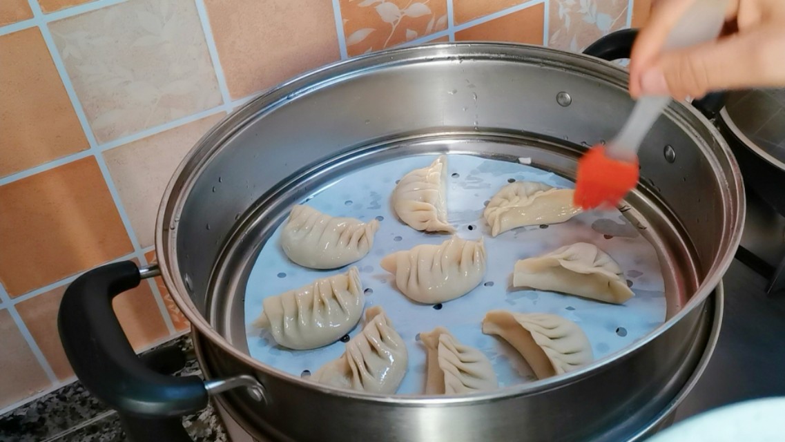 5,所有饺子包好后,放入蒸锅,给每个饺子刷一层薄油,锁住水分。