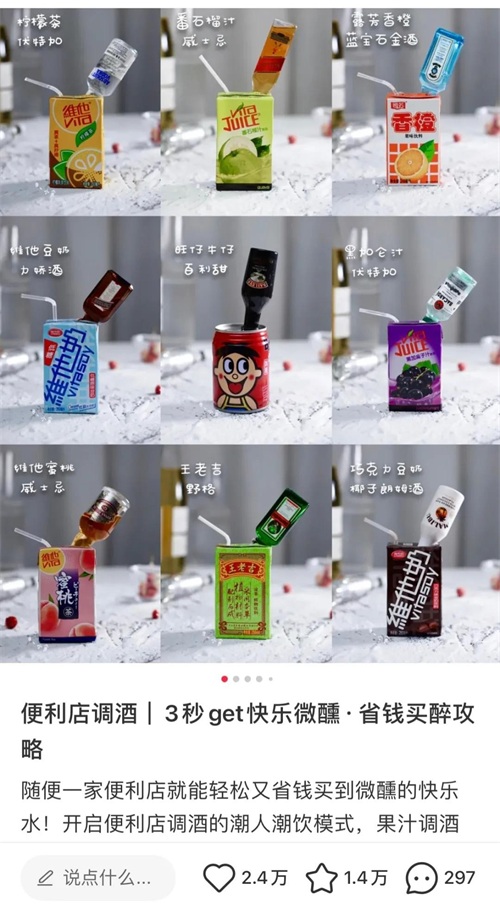 果立方系列推出后,江小白将重点放在产品自身的体验上,玩起了#江小白混饮#的戏码。比如江小白和旺仔联合,鼓励用户混合制成一杯“忘仔酒”;或是和可口可乐混合,再加上橙汁、冰块制成一杯“特制长岛冰茶”。市面上几乎所有知名的饮品,江小白都能进行“梦幻联动”,而这种隐藏式喝法大揭秘,容易让消费者产生猎奇心理,也容易与竞品产生区分。