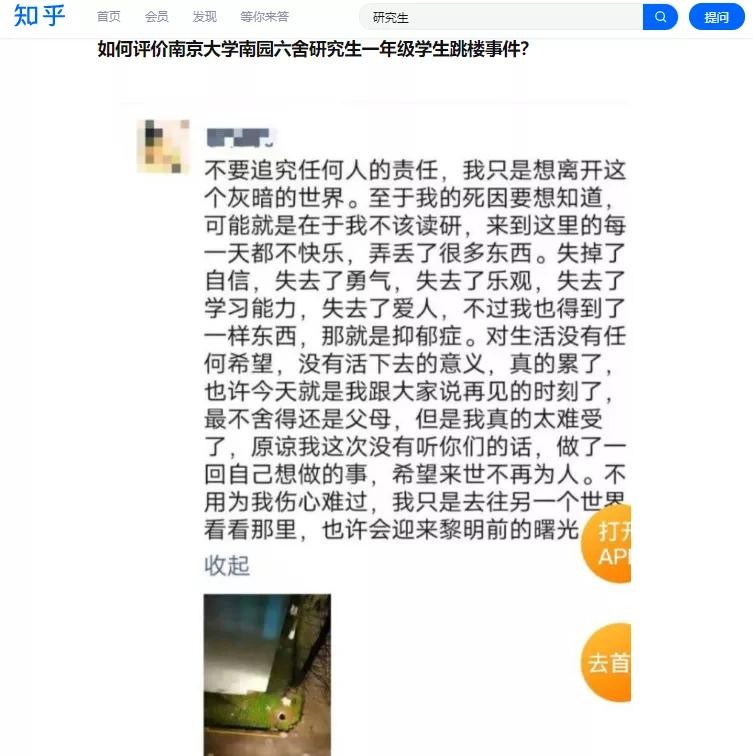 最近,知乎一则问题引发热议!“如何评价南京大学南园六舍研究生一年级学生跳楼事件?”,据悉,这位研一的同学跳楼自杀并留下遗言,疑因学业压力过大。