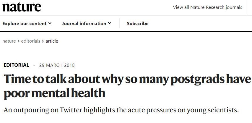 研究生的心理问题已经成为一个普适性的问题,国内外都一样。Nature曾发表文章“Time to talk about why so many postgrads have poor mental health”,其中提到:研究生报告的抑郁和焦虑比例比一般人群高六倍。被调研的博士生中有三分之一目前已经出现心理问题,或者有患上心理疾病的风险。对美国亚利桑那大学博士生进行的一项调查发现,约四分之三的博士生承受着「高于平均水平」的压力。