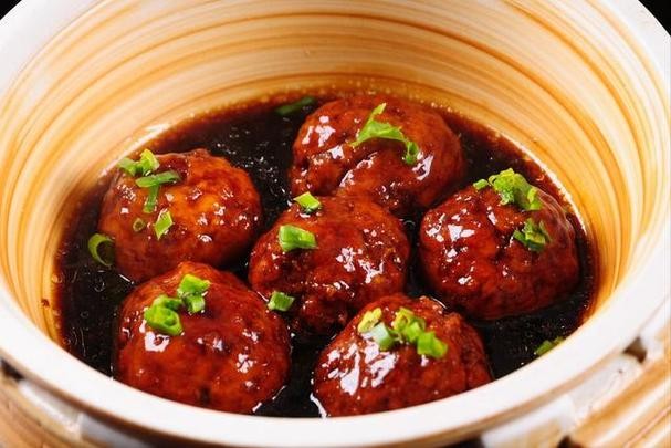 这道菜是将猪的前腿肉、荸荠等食材一起打成碎末后,再加入调味料做成圆形的大丸子,经过精心烧制而成,最后再配上青菜,撒上葱花即可。