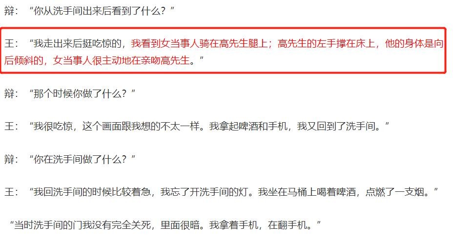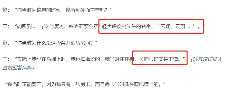 而在酒店的房间里,据王晶描述,女受害人主动的简直让人出乎意料,在高云翔来到王晶的房间之后,一会功夫,女受害人就和高云翔开始了关系,而且速度之快还让王晶感叹“长得帅确实是王道”。