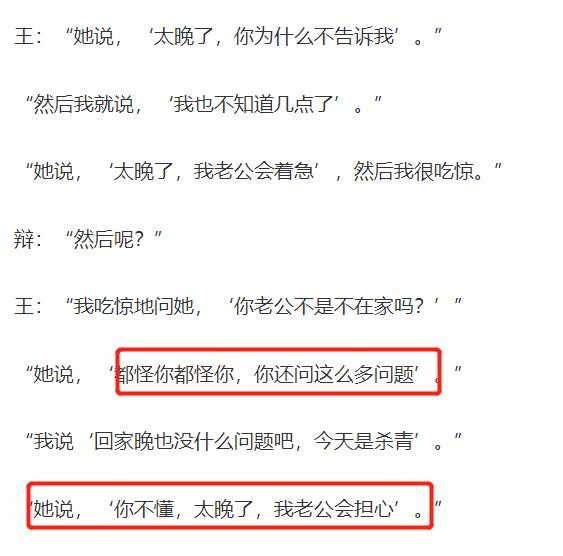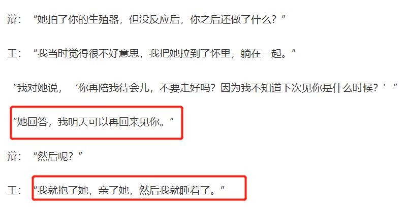 而两人在KTV中拥吻的细节,在之前的证人口中已经可以知道两人是你情我愿。后来在唱K结束之后,王晶还主动提议女受害人可以先走,理由是“你已经结婚了”。但是女受害人的反应却出乎意料,对王晶的劝告非常不在意,甚至有点不耐烦。