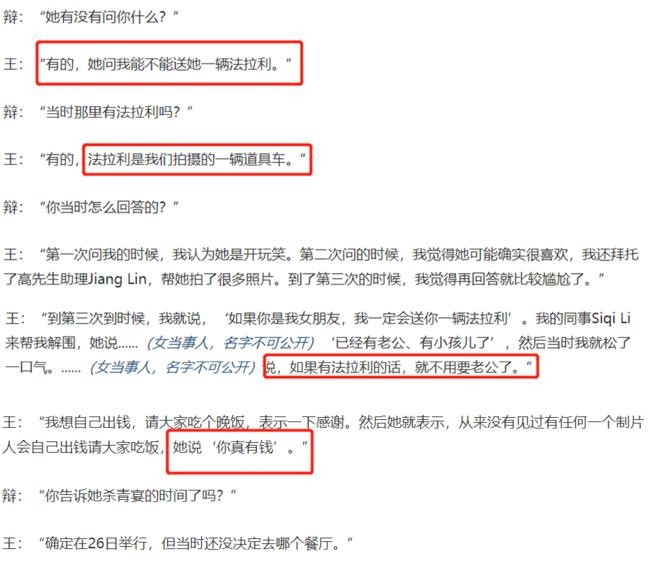 在庭审现场,辩方还是围绕了一个中心点进行正问,女受害人与王晶到底是什么关系,两人怎么结识的,王晶的回答是通过朋友认识,项目没有经过招标的方式,直接给了女受害人。另外辩方还问及了王晶女受害人是否索要过法拉利跑车,王晶的回答是的,并且索要了4次,头一次王晶以为女受害人在开玩笑,并且还帮助女受害人与剧组的道具法拉利跑车合影。