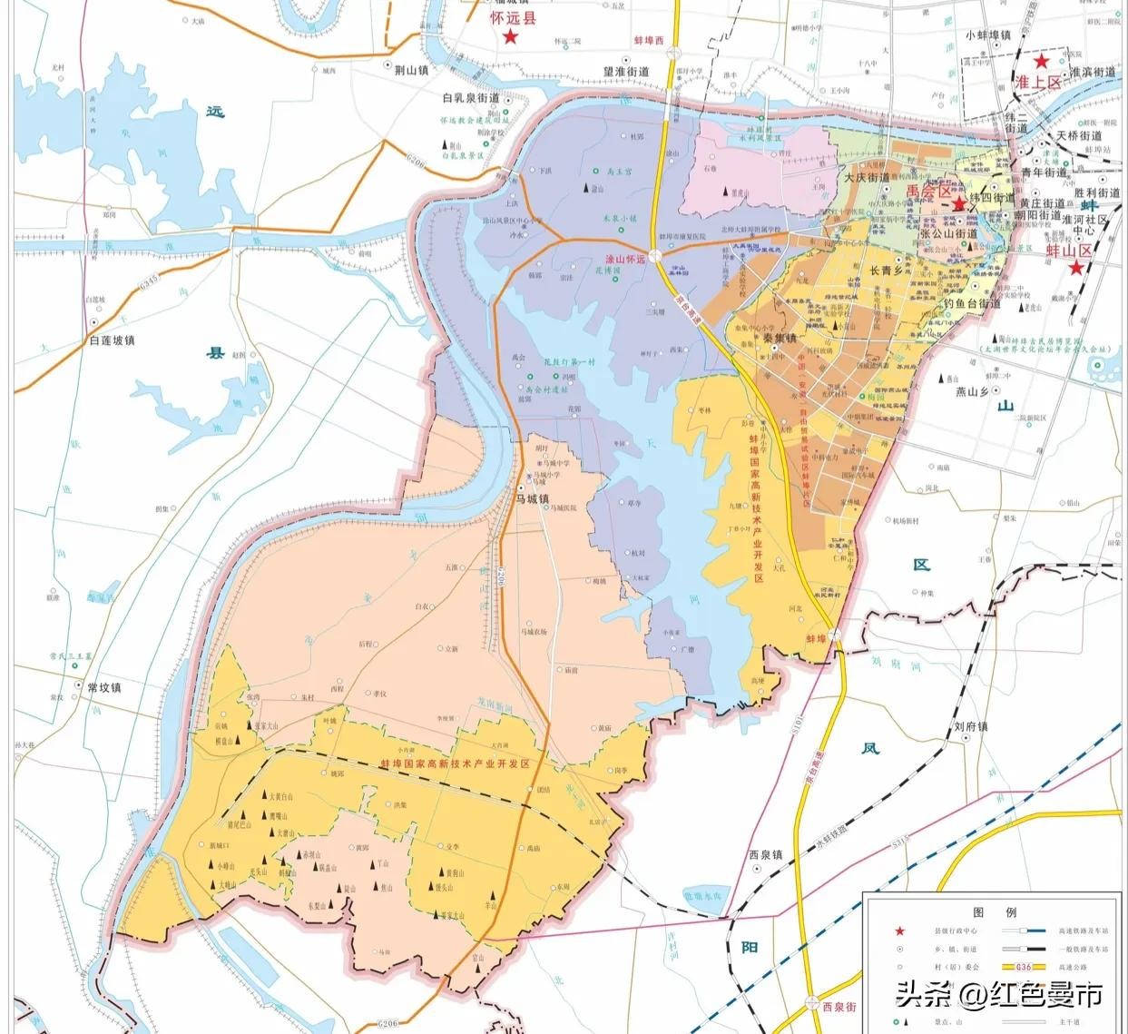 而剔除被蚌埠高新区代管的区域后才是禹会区的实际管理范围,217平方公里的面积仅为行政区划面积(331平方公里)的65.5%。