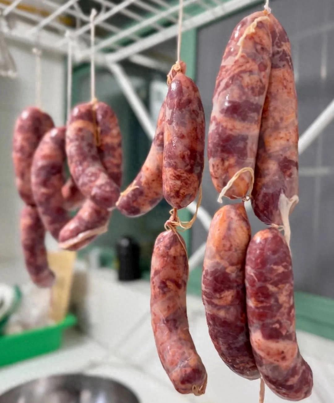 制作香肠是个技术活,得注意卫生,确保所有工具和容器都干净。灌肠时,肉泥或肉丁要均匀填充到肠衣里,别太紧也别太松。灌好后,用绳子把香肠扎成一段一段的,挂在通风阴凉的地方晾晒。