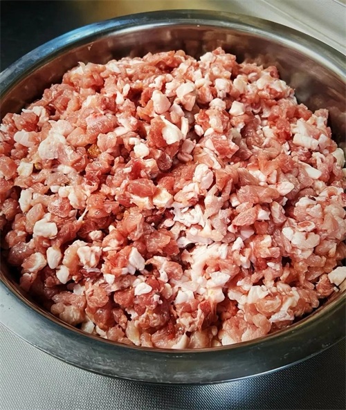 猪肉要切成小丁或绞成肉泥,这里也有讲究。小丁的话,香肠吃起来更有嚼劲;肉泥的话,香肠口感会更细腻。切的时候得注意肉块大小要均匀,这样才能顺利灌肠。