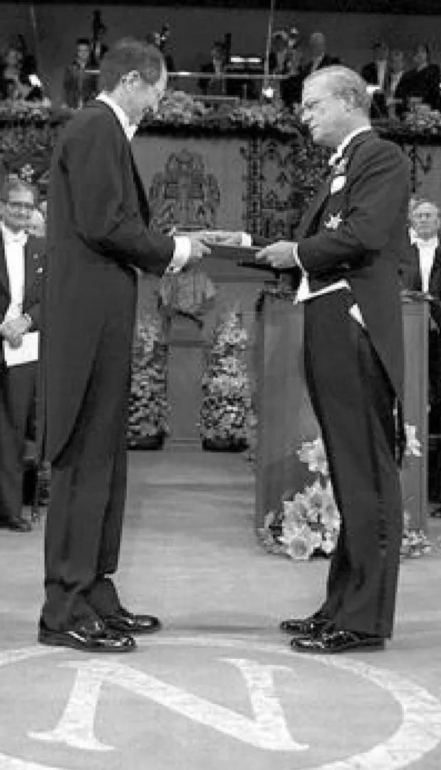 1998,崔琦从瑞典国王手中接过诺贝尔奖证书和奖章