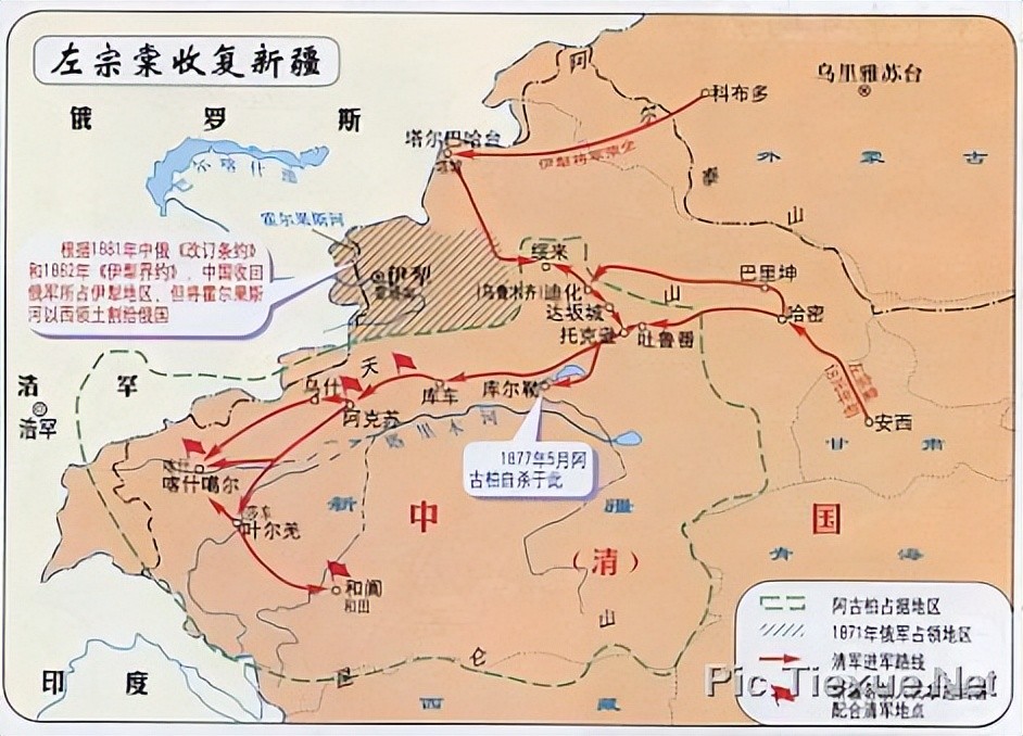 正是左宗棠的坚持与据理力争,让朝廷下定决心出兵收复新疆。而左宗棠也不负所望,通过精心筹备,制定 “先北后南,缓进速战” 的战略,率领清军经过艰苦卓绝的战斗,先后收复了北疆、南疆等地,最终除伊犁地区外,新疆大部分领土重回祖国怀抱,之后又通过外交和军事施压等手段,促使沙俄归还了伊犁地区,实现了新疆全境的收复。可以说,左宗棠用实际行动守住了我国的西北边疆,避免了国家领土被列强进一步蚕食,维护了领土完整这一国家的核心利益,其贡献彪炳史册。