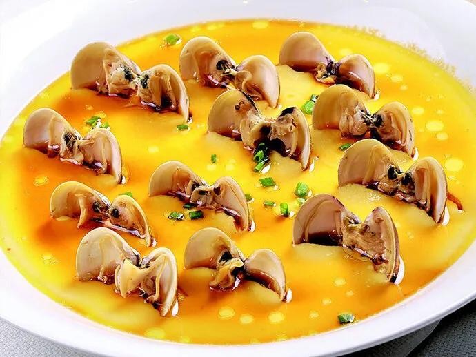 3.将焯烫好的花蛤摆入碟中;将搅拌好的蛋液过滤进摆好的花蛤中;