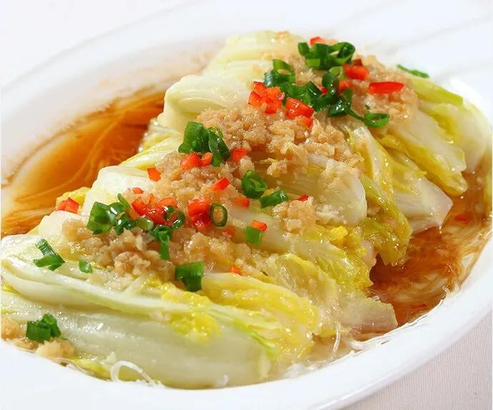 4.泡软的粉丝铺在盘底,摆放娃娃菜;