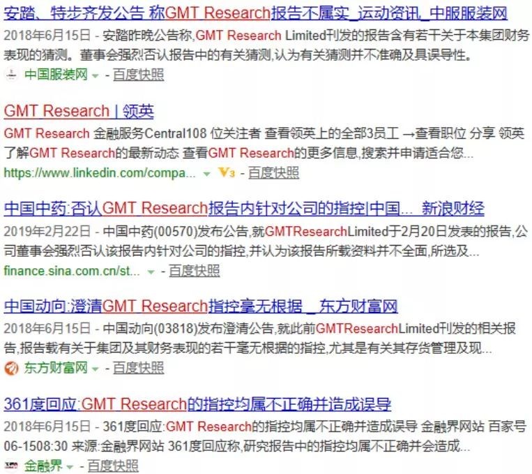 GMT Research历史上黑过的公司主要集中在医药和体育品牌两大行业。中国医药、国药控股、58同城、京东与中国交建都被其唱空过,而安踏、特步、36度也遭其指控。