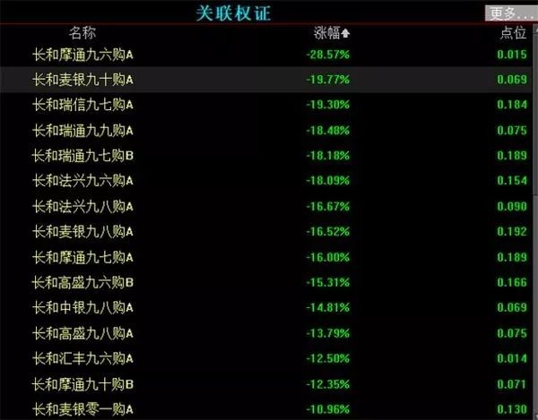 过去一年多时间,长和已经下跌近25%。长和认购证14日更是迎来集体暴跌,跌幅都在14%以上,跌幅最大的长和摩通九六购A杀跌28.57%。