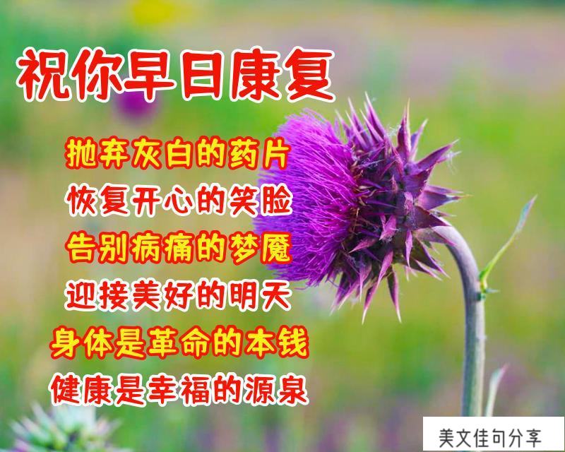 13、抛弃灰白的药片,恢复开心的笑脸,告别病痛的梦魇,迎接美好的明天,身体是革命的本钱,健康是幸福的源泉。祝你:早日康复!