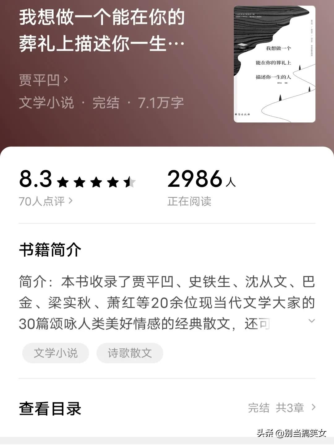 1.《我想做一个能在葬礼上描述你一生的人》本书收录了贾平凹、史铁生、沈从文、巴金、梁实秋、萧红等20余位现当代文学大家的30篇颂咏人类美好情感的经典散文,还可在作家笔下看见关于鲁迅、冰心、徐志摩、叶圣陶、曹禺、蔡元培、李叔同等的往事回忆。