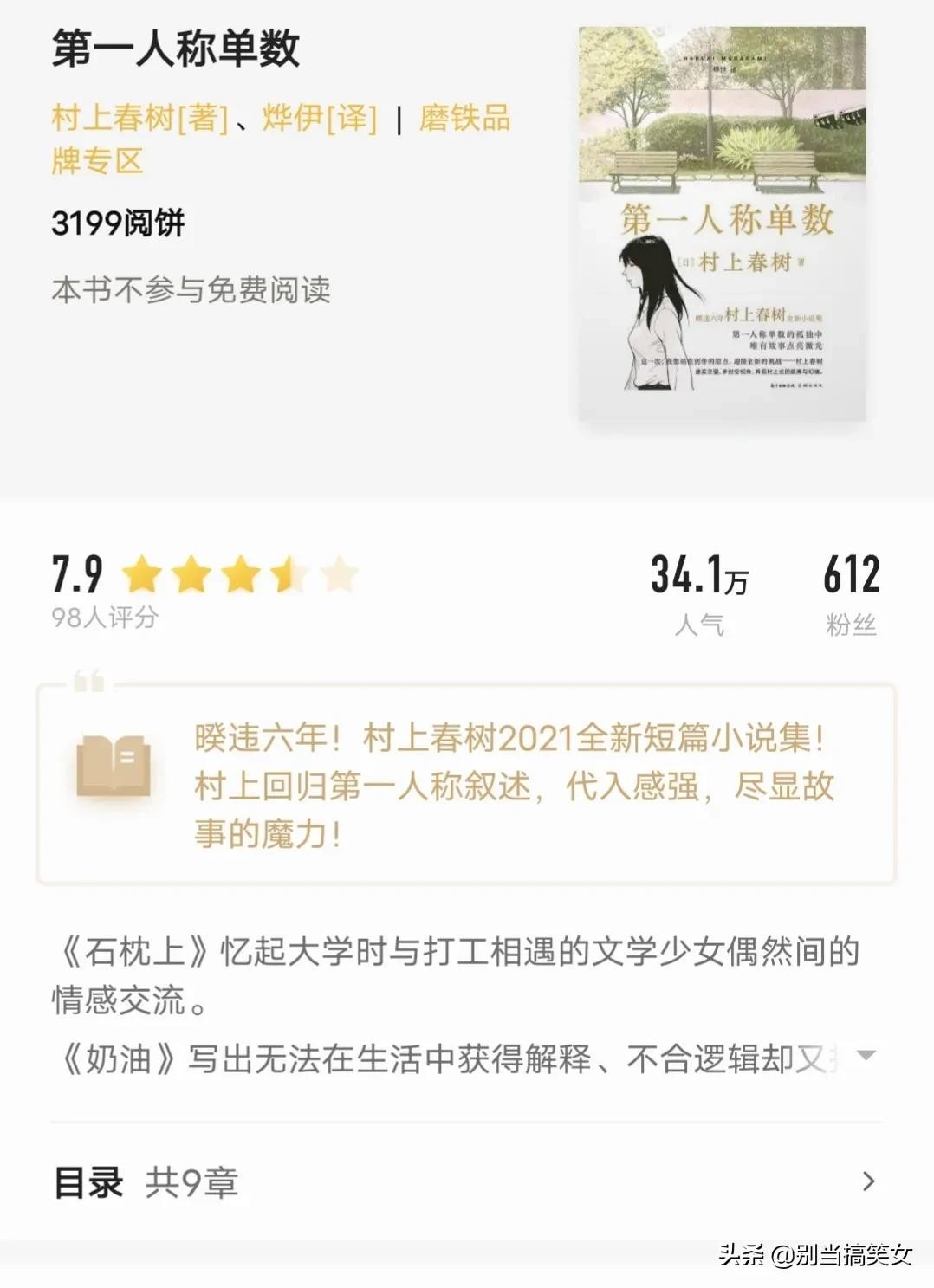 4.《第一人称单数》本书所收录的故事,均采用“我”的第一人称视角亲口讲述,围绕记忆这个主题,落笔于一些生命中没有缘由的小事,精妙地刻画了都市人无处排解的孤独、无奈以及现代生活的苦闷。本册小说是对爱与死的深刻思考,体裁上融合了短歌、散文、音乐与小说,正是熟悉的村上风格。
