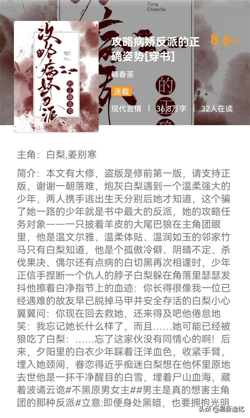 这个小说蛮特别的,这个小说的男主角从头到尾都没有被洗白,男主角真的从头到尾都是反派,就是你看其他的小说中的那种给男女主制造麻烦的那种真反派,这本挺好看的