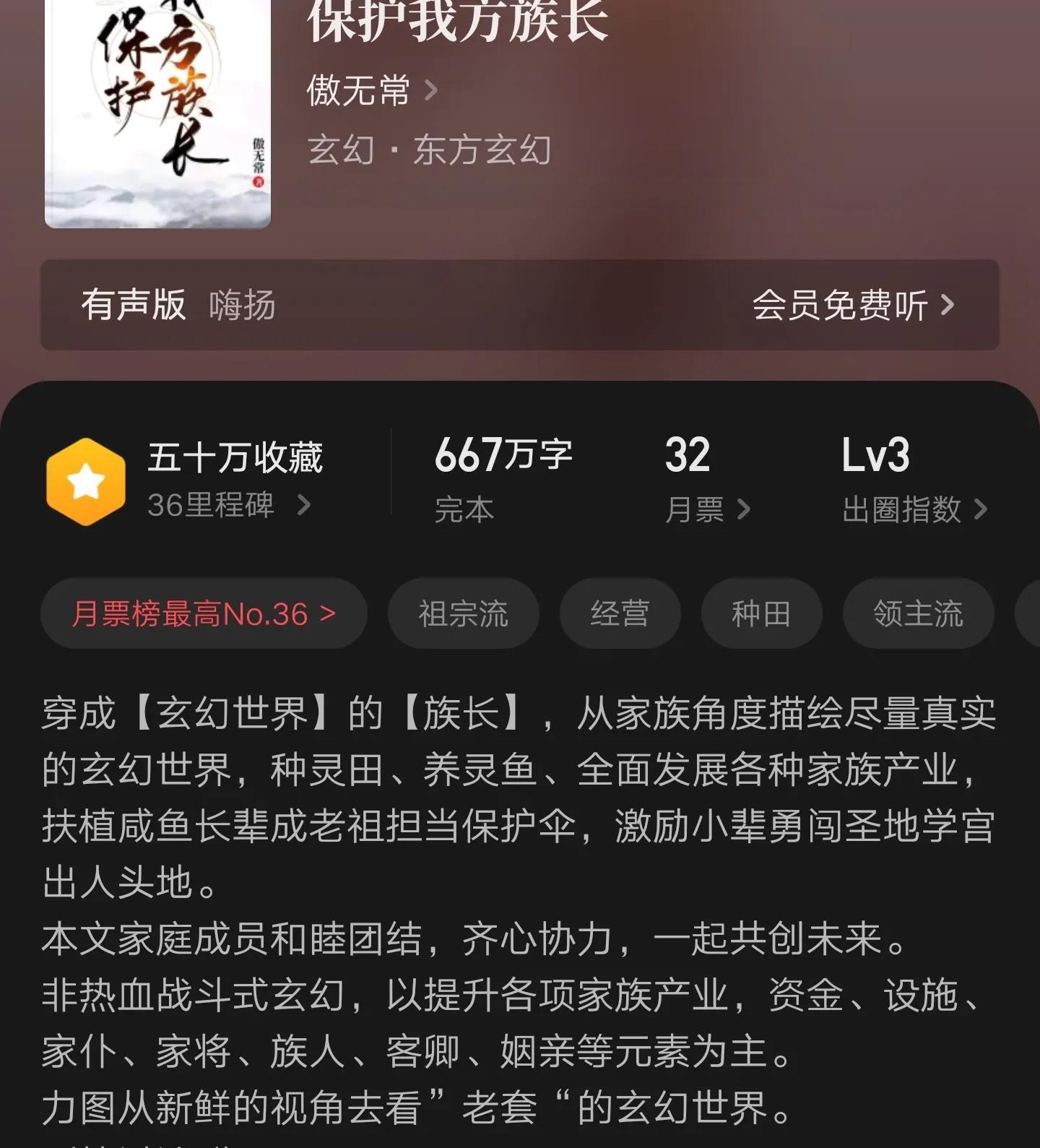 读后感:与一般家族流小说不同,这本更注重种田发育,打斗内容较少。