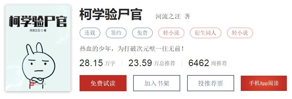 五级作者河流之汪的《柯学验尸官》,作者的上一本书jojo同人小说《李青的奇妙冒险》也是听很多人推荐过,基本都是好评。河流之汪的小说基本都在一百万上下左右完本,比普遍的两百万字左右少了很多。