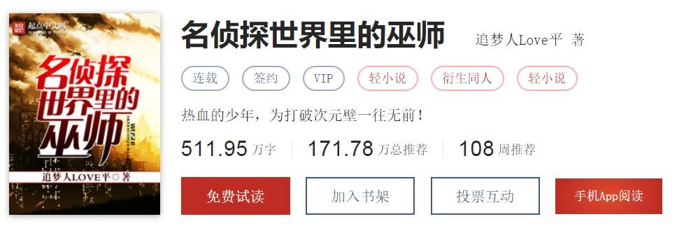 五级作者追梦人Love平的《名侦探世界里的巫师》,五百万字超肥,也是之前眼熟的书了。