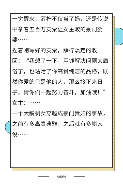 第五本:一个大龄女主穿书之后,成了豪门婆婆,还是那种甩给书中女主支票五百万,让她离开自己儿子的女主……还好她穿进来的够早,在要甩给书中女主支票时穿过来,五百万的支票留给自己不香么~