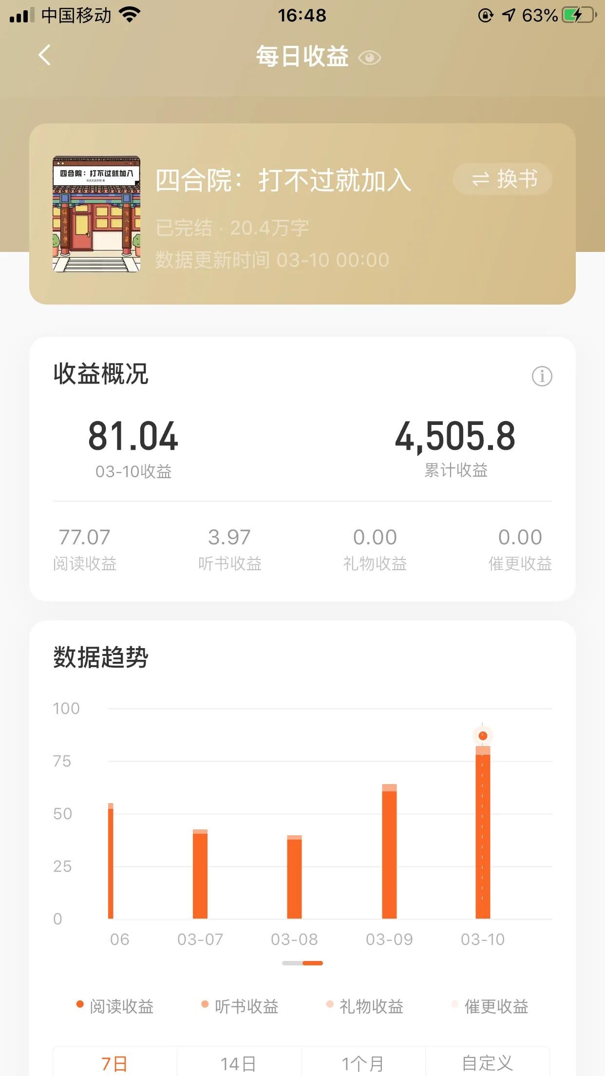 左边的3月10日收益81就是完结后,昨天的收益了。要知道我这完结的小说也已经完结半个月左右了。