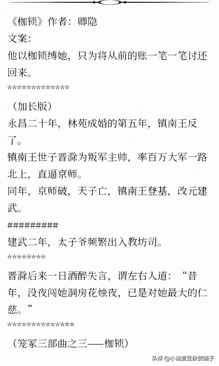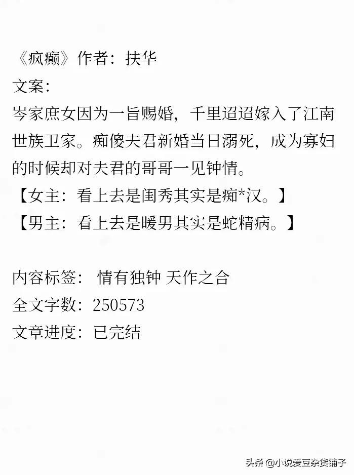这本小说设定和其他也不太一样,男女主都不是正常人,是病娇!奇奇怪怪的。女主嫁给男主哥哥,结果新婚当天,傻丈夫就没了。女主留在那里,却对男主一见钟情了。女主这个人吧,有情感障碍,无法正确对待感情。男主也是王八看绿豆,看上眼了,本质就是个偏执狂,就是两个病娇谈恋爱的故事。里面配角故事也很好看,好几对爱情故事磕到了!