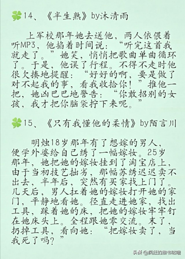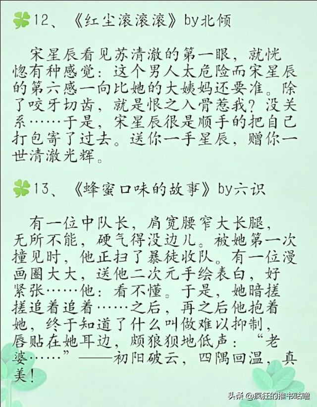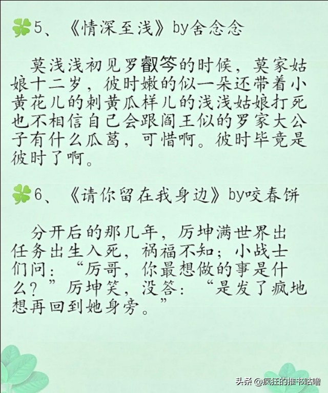 强烈推荐《丝丝入骨》、《白色橄榄树》、《他与爱同罪》、《半生熟》,真的太爱了,没推荐不代表不好看哦,25本都是咕噜精选的,喜欢的话先收藏起来慢慢看哦(。>ㅿ<。)