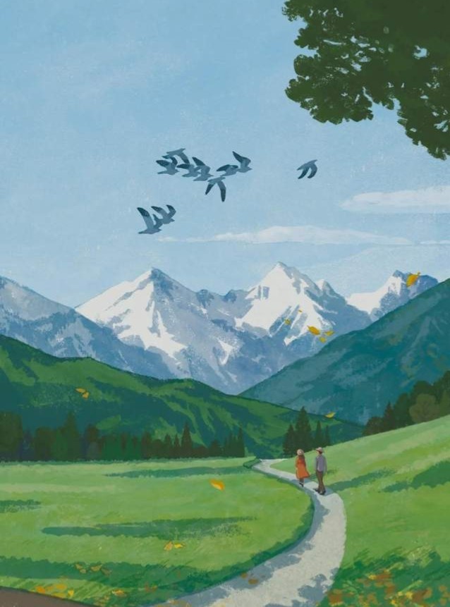 “ 太阳已经高高升起,群山,树林,村子、农田…所有一切都安详的浮现在温和的秋日里。这平时熟悉的景物,但如果不是在此刻,恐怕连我们自己也无法满怀幸福感的眺望吧”是呀,我们往往过于追求结果,喜欢追忆旧时的幸福时光,而能感觉到眼前的幸福是多么重要的能力。