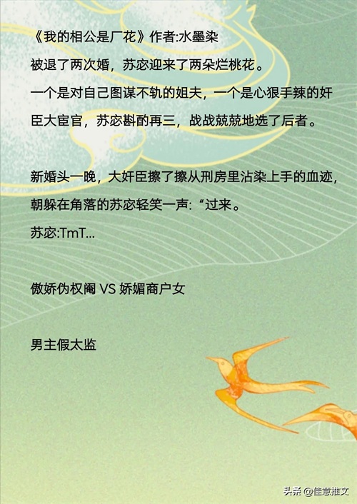 提到太监,大家头脑中第一个浮现的人是谁呢?是电影《龙门飞甲》里妖艳、冷酷的西厂厂公雨化田?能书会画,身上有着超凡脱俗的书香文人气质的怀吉?还是《如懿传》对惢心满心欢喜的李玉?今天就来给大家推荐几本男主是太监的小说,有真太监也有假太监,大家挑选喜欢的看吧!有备注。