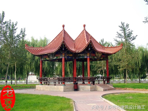 第六,鸳鸯亭子设计图,顾名思义,也是两个亭子紧靠在一起。很有特点,体现了园林建筑中的曲折美。