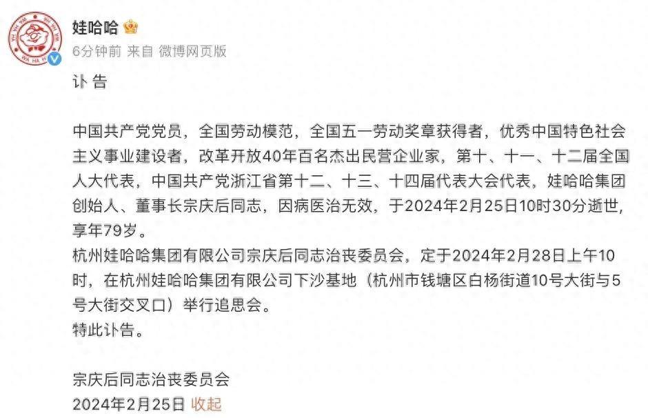 中国共产党党员,全国劳动模范,全国五一劳动奖章获得者,优秀中国特色社会主义事业建设者,改革开放40年百名杰出民营企业家,第十、十一、十二届全国人大代表,中国共产党浙江省第十二、十三、十四届代表大会代表,娃哈哈集团创始人、董事长宗庆后同志,因病医治无效,于2024年2月25日10时30分逝世,享年79岁。