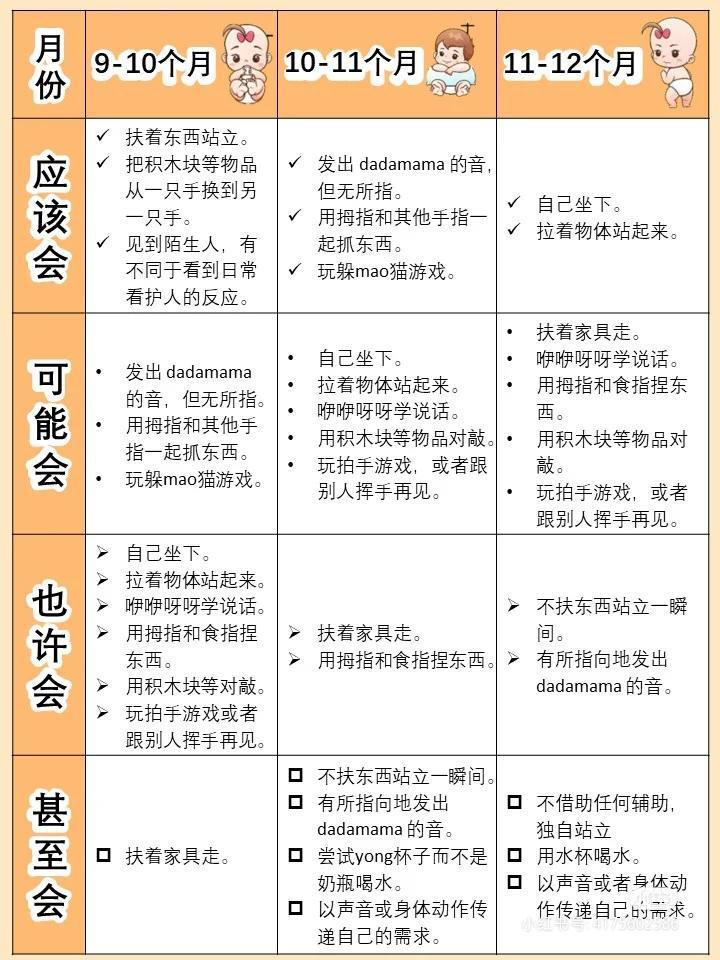宝宝 0-12月长得非常快,具体生长发育进度可以参照崔玉涛宝宝 0-12月生长发育参照表,发育进度包括大运动、精细动作、语言能力、认知能力,此表对应每个月宝宝应该会哪些、可能会哪些、也许会哪些、甚至会哪些。每一个宝宝都有自己的生长轨迹,不必生搬硬套,慢一点快一点都没有关系,不必焦虑。但是爸爸妈妈门要大概知道每个阶段宝宝大致应该会哪些大运动、精细动作、语言、认知,如果差距太大,就必须及时就医,根据医S的专业意见进行干预。