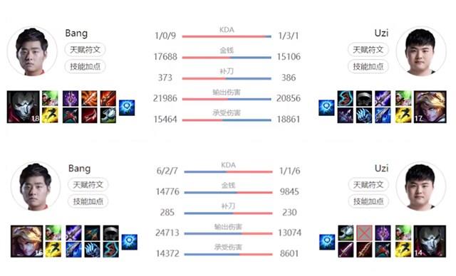 比赛的前三场Bang确实被UZI压制的很惨,Bang的一只脚仿佛都已经踏进了深渊,但是毕竟是两冠ADC底子还是有的,三场的压制也算是激发了Bang沉封的好胜之心,第四场比赛开始Bang又成为了那个无情的输出机器。使用大嘴在高地前击杀了想要趁乱进场输出的老鼠,将SKT拖入了决胜局,并且在第五局中一鼓作气拿下了比赛。