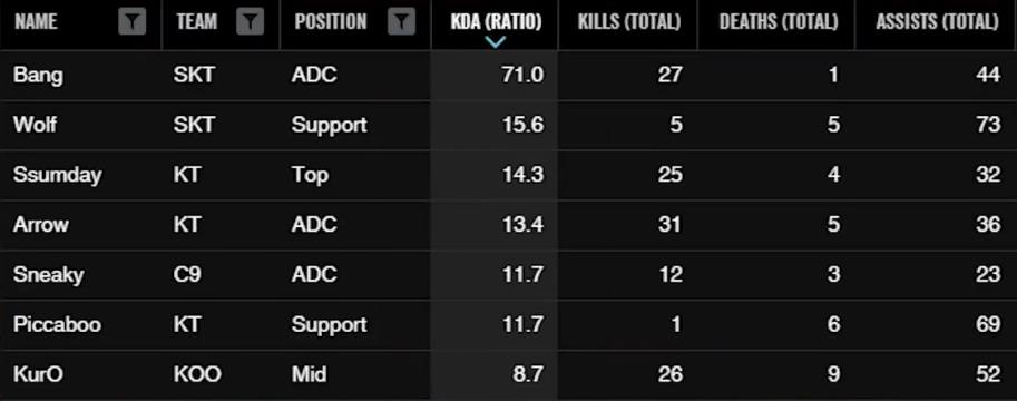 但是我们常说功夫不负有心人,更何况电竞本来就是一项只要努力就能大概率收获回报的比赛,更何况Bang还有天赋比他更好还比他更努力的人当队友。小组赛SKT以6-0的成绩出线,Bang作为高危位置的ADC更是一次没死过,KDA达到了惊人的71。