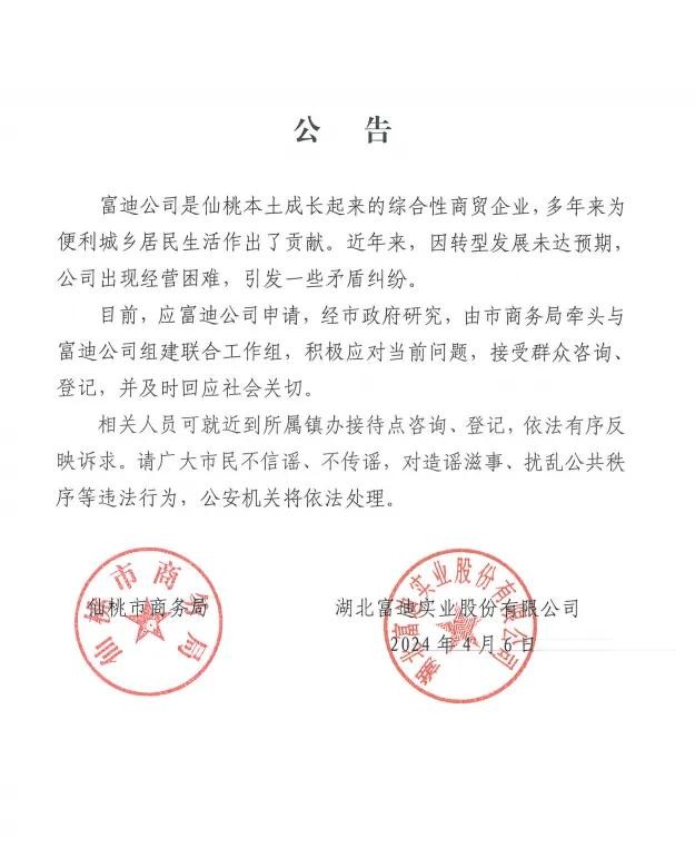 公告表示:目前,应富迪公司申请,经市政府研究,由市商务局牵头与富迪公司组建联合工作组,积极应对当前问题,接受群众咨询、登记,并及时回应社会关切。