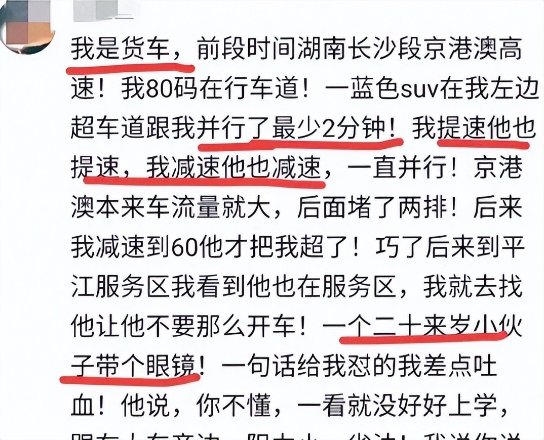 事件曝光后,许多人感到气愤,尤其是那些高速公路上的老司机。他们呼吁新手司机不要上高速,更不要以太慢的速度行驶。网友也分享了一些自己的经历,其中有一位货车司机回忆了一次与一位SUV车主的行驶经历,该车主不仅开得缓慢,还随意变道,最终导致拥堵和危险的局面。
