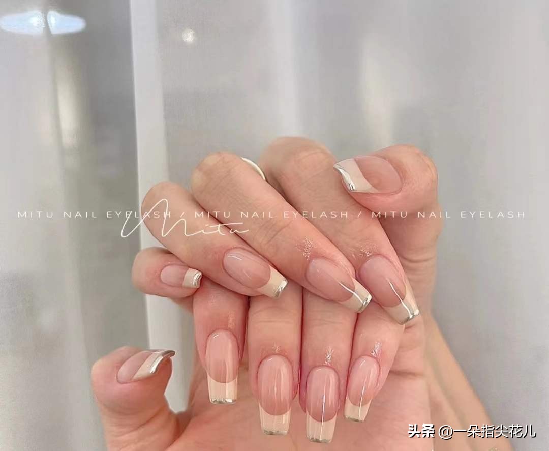 第九款:渐变色打底,搭配弧形法式,和金属胶银色小边。